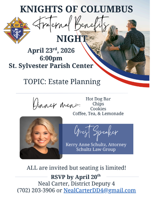 Welcome to the Mario “Chick” Alberghini Council 13277 at St Sylvester Catholic Church. The Knights of Columbus is a Catholic men's fraternal benefit society for men 18 years of age and older that was formed to render financial aid to members and their families. Mutual aid and assistance are offered to sick, disabled and needy members and their families. Social and intellectual fellowship is promoted among members and their families through educational, charitable, religious, social welfare, war relief and public relief works.